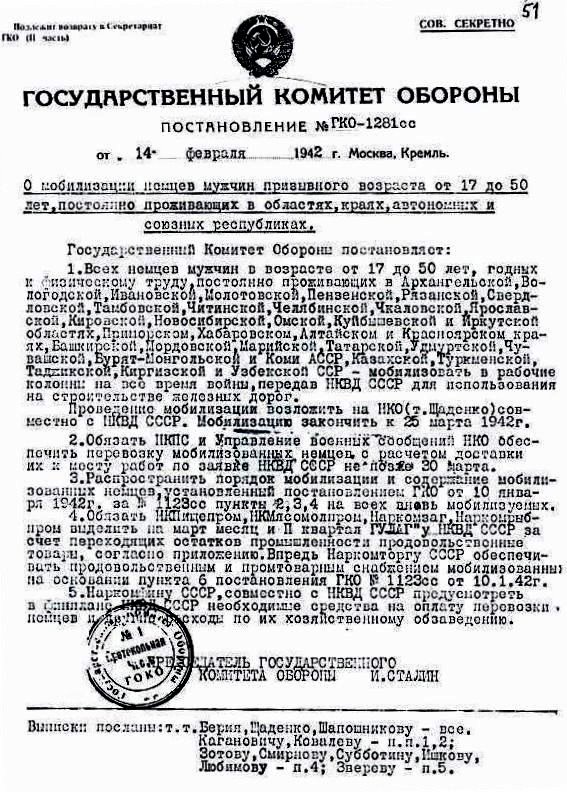 По состоянию на 1 января 1942 года на стройках и в лагерях НКВД работали 20 800 мобилизованных немцев. Еще несколько тысяч немцев трудились в рабочих колоннах и отрядах, переданных другим народным комиссариатам.
