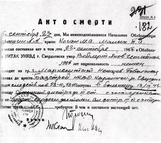 Акт о смерти Я.И. Вейлерта (бывшего заместителя председателя Совнаркома АССР НП) 23 сентября 1945 г. в г. Свердловске, наступившей вследствие побоев, полученных им в ходе предварительного следствия. Источник: Книга Памяти трудармейцев Богословлага. Фото из архива В. Кригера.