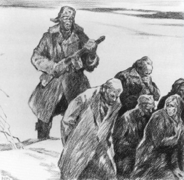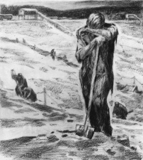 Утром по команде «Подъем» могли встать не все. Каждый день оставались лежать 2–3 окоченевших трупа. Если оказывался больной и не мог встать, вызывали начальника лагеря. Он определял, не симулянт ли. При малейшем подозрении охранники били и гнали на работу. Если не помогало, перетаскивали в больницу – отдельно стоящую палатку с тифозниками, дизентерийными больными. Там они в основном умирали. Отца, как физически крепкого, определили в похоронную бригаду. За это давали дополнительный кусочек хлеба. Обязанностью бригады было переносить умерших за километр от лагеря, за колючую проволоку, и складывать в заранее выкопанную большую яму.