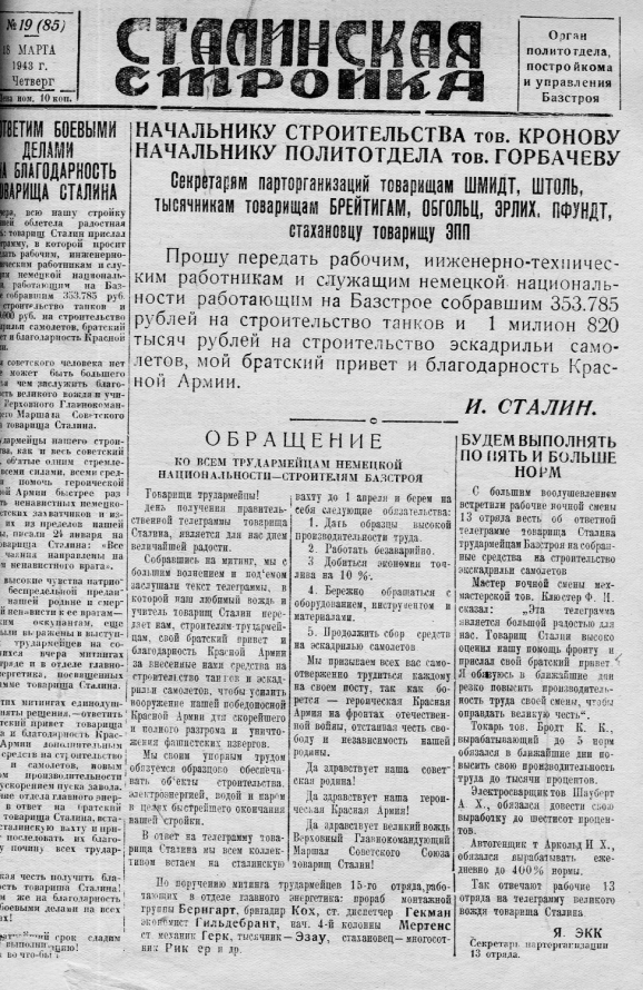 Благодарность Сталина строителям Базстроя. Газета «Сталинская стройка». № 16. 3 марта 1943 г. / Книга Памяти трудармейцев Богословлага. Фото из книги «Мы – заводчане». Екатеринбург, 2005